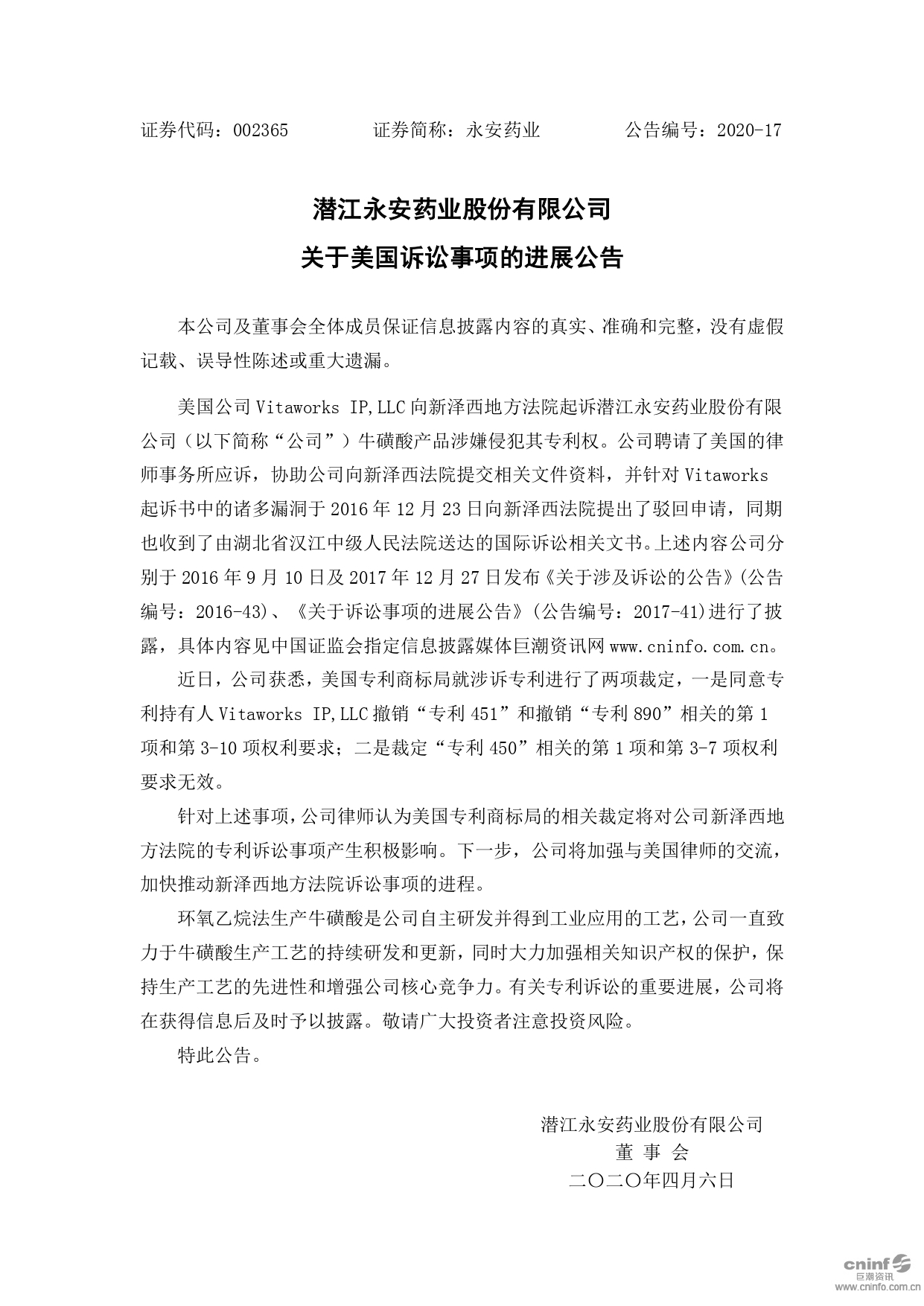 關(guān)于美國訴訟事項(xiàng)的進(jìn)展公告