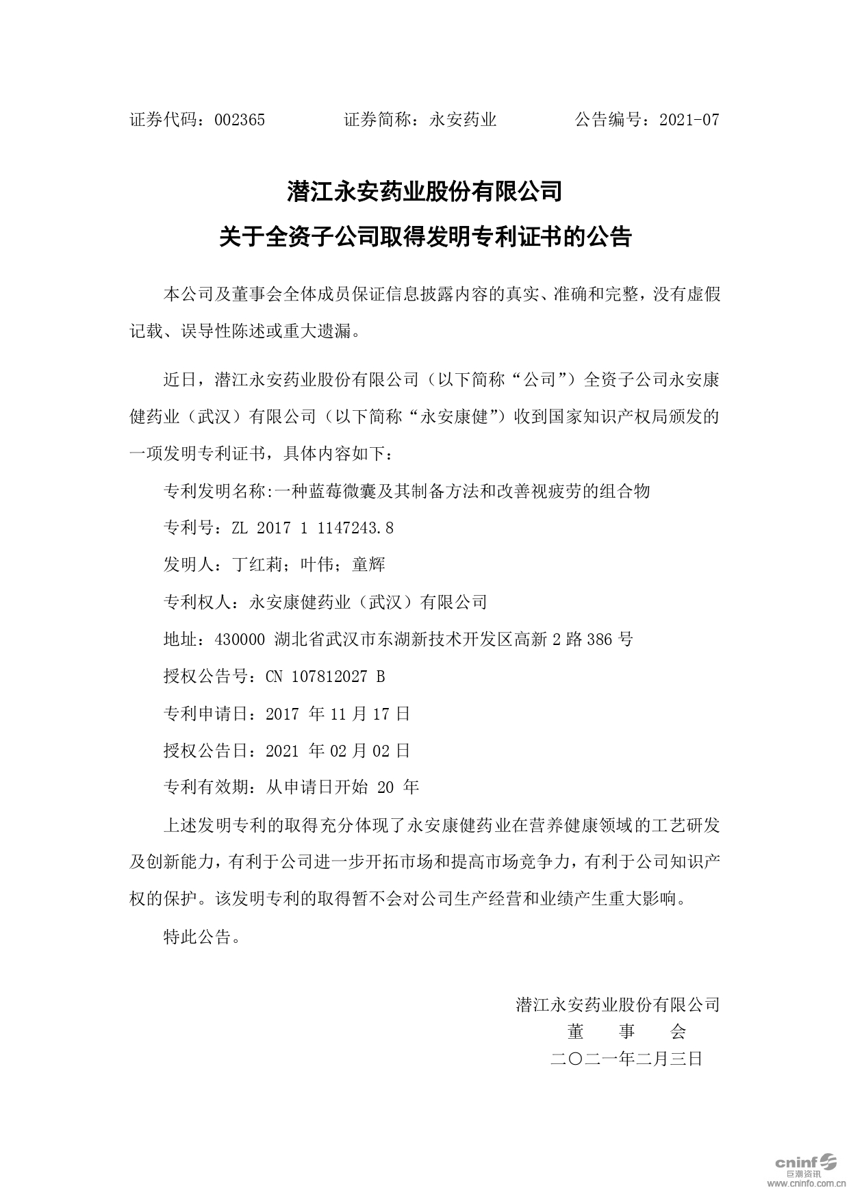 關(guān)于全資子公司取得發(fā)明專利證書的公告